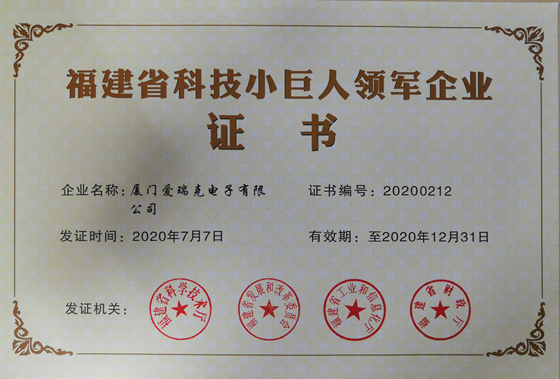 熱烈祝賀廈門愛(ài)瑞克電子有限公司在2020年7月27日獲得福建省科技小巨人領(lǐng)軍企業(yè)證書